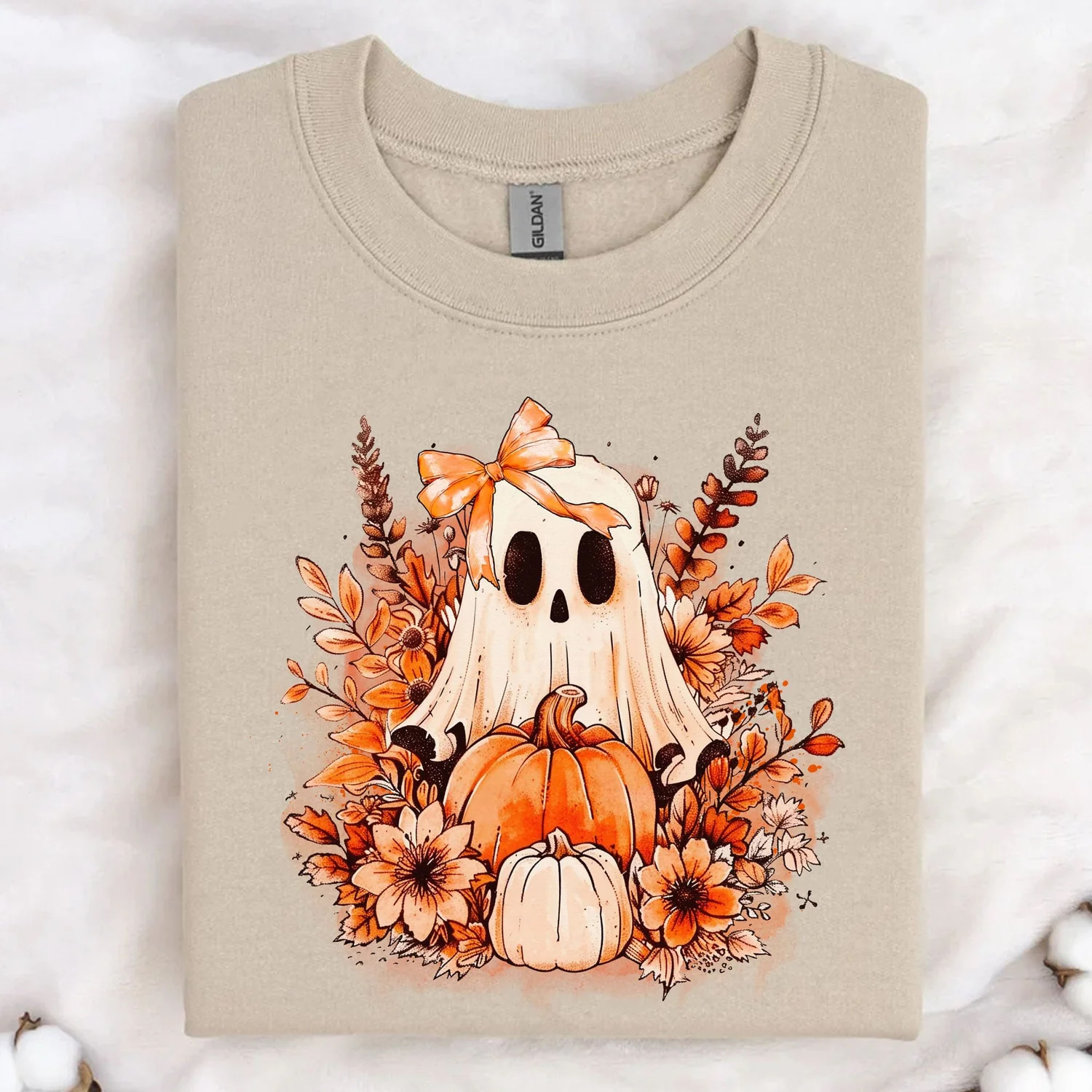 Graphic: High-quality printed retro ghost and pumpkin artwork.